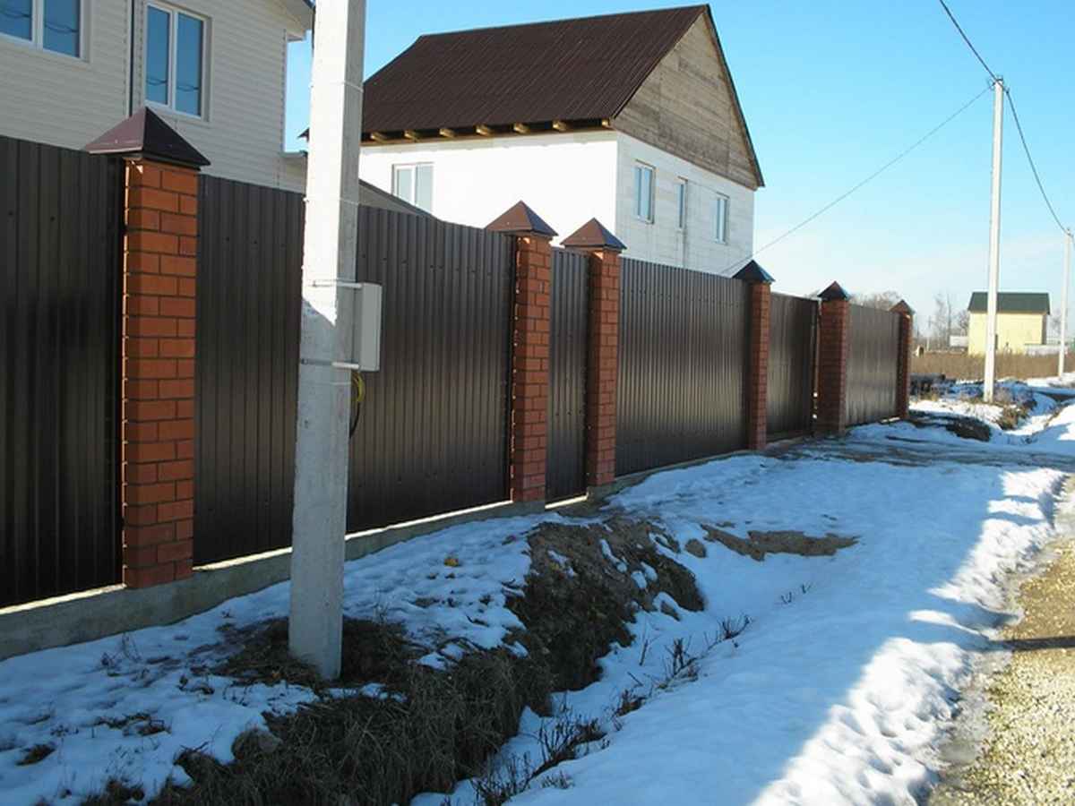 Забор из профнастила с кирпичными столбами 55 метров